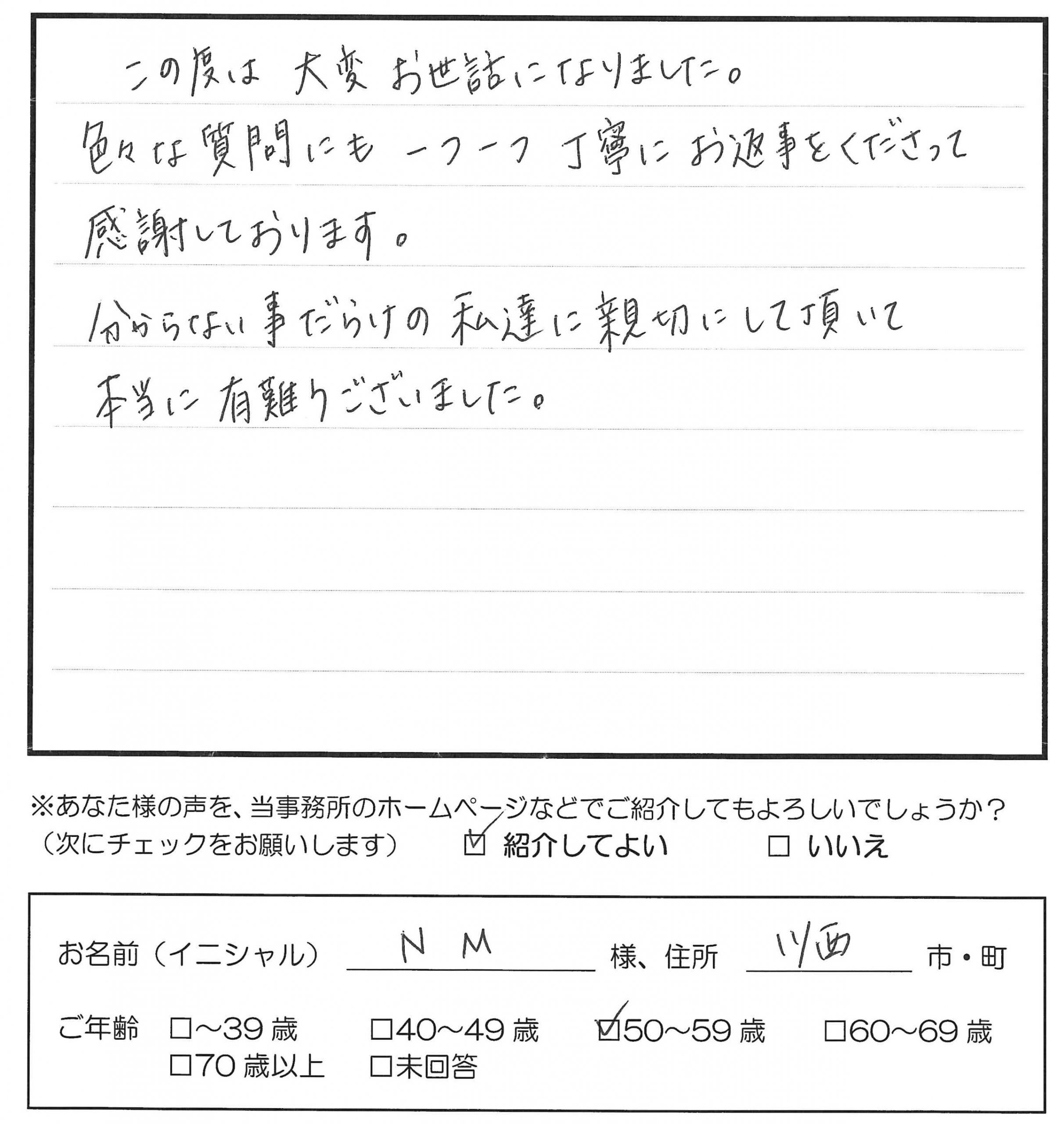 ホーム > お客様の声 > お客様の声 川西市 N.M様 相続登記 公開日:2025/10/20 この度は大変お世話になりました。 色々な質問にも一つ一つ丁寧にお返事をくださって感謝しております。 分からない事だらけの私達に親切にして頂いて本当に有難うございました。 (相続登記) お客様の声