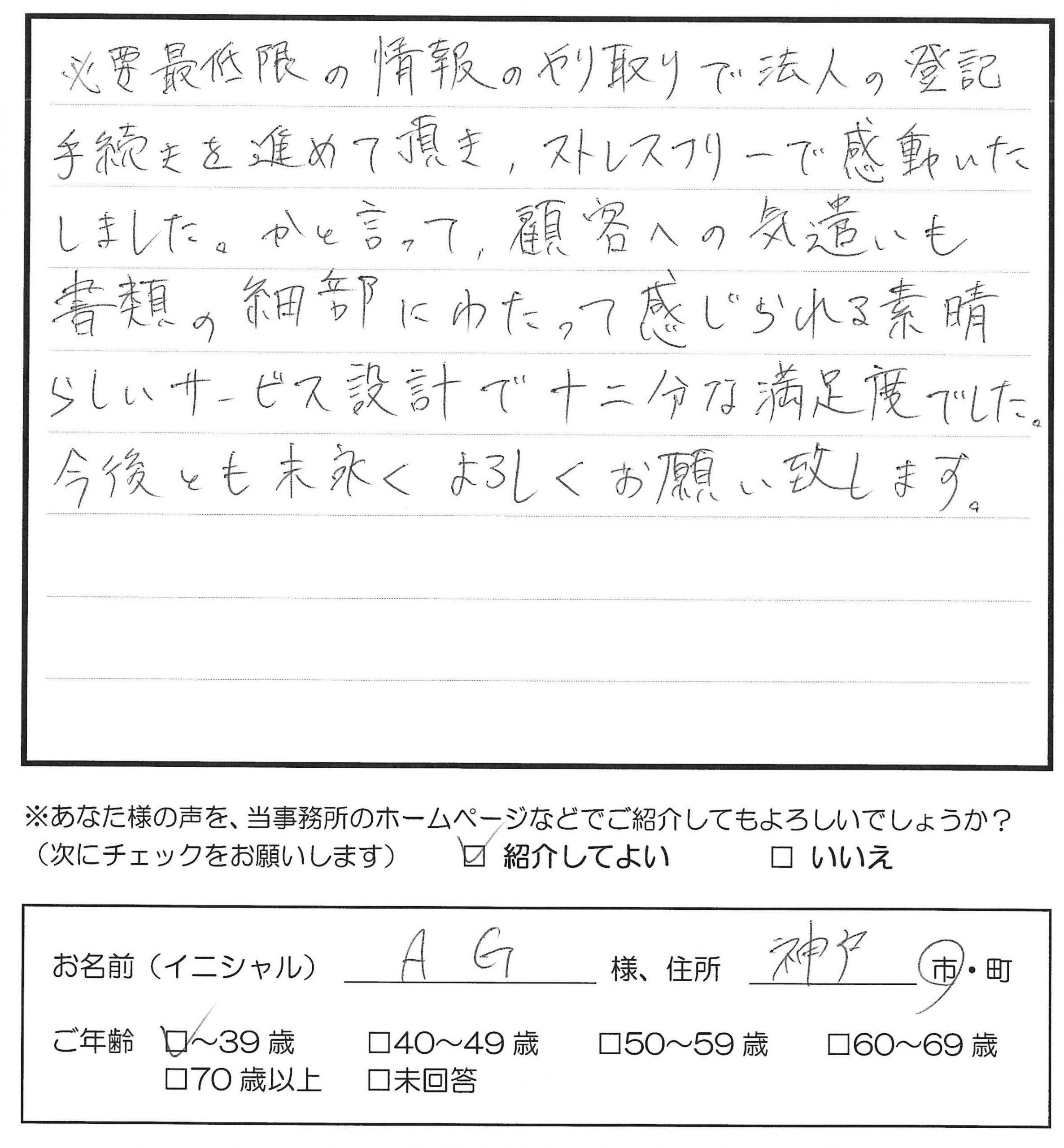 お客様の声 神戸市 A.G様 会社登記